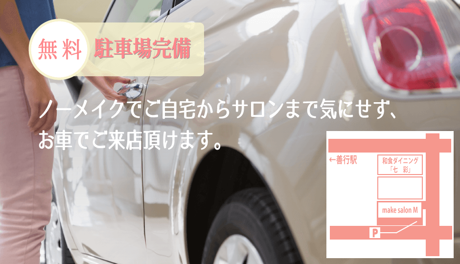 make salon Mでは無料駐車場を完備しておりますので、ノーメイクで来て頂き、ノーメイクでお帰り頂くことができる隠れ家的なサロンです。
